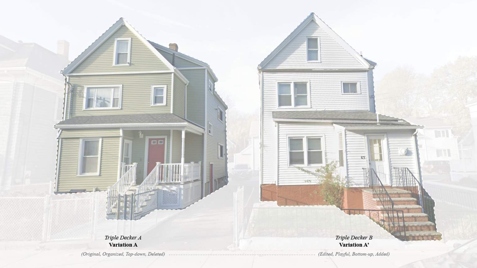 Studying and documenting a found pair of Triple Deckers, we concluded that Triple Decker B is an evolved state of a triple decker A typology. From the original type, Triple decker B evidences a result of an accumulation of edits that took place under some degree of pressure to better fulfill the contemporary needs of its inhabitants.